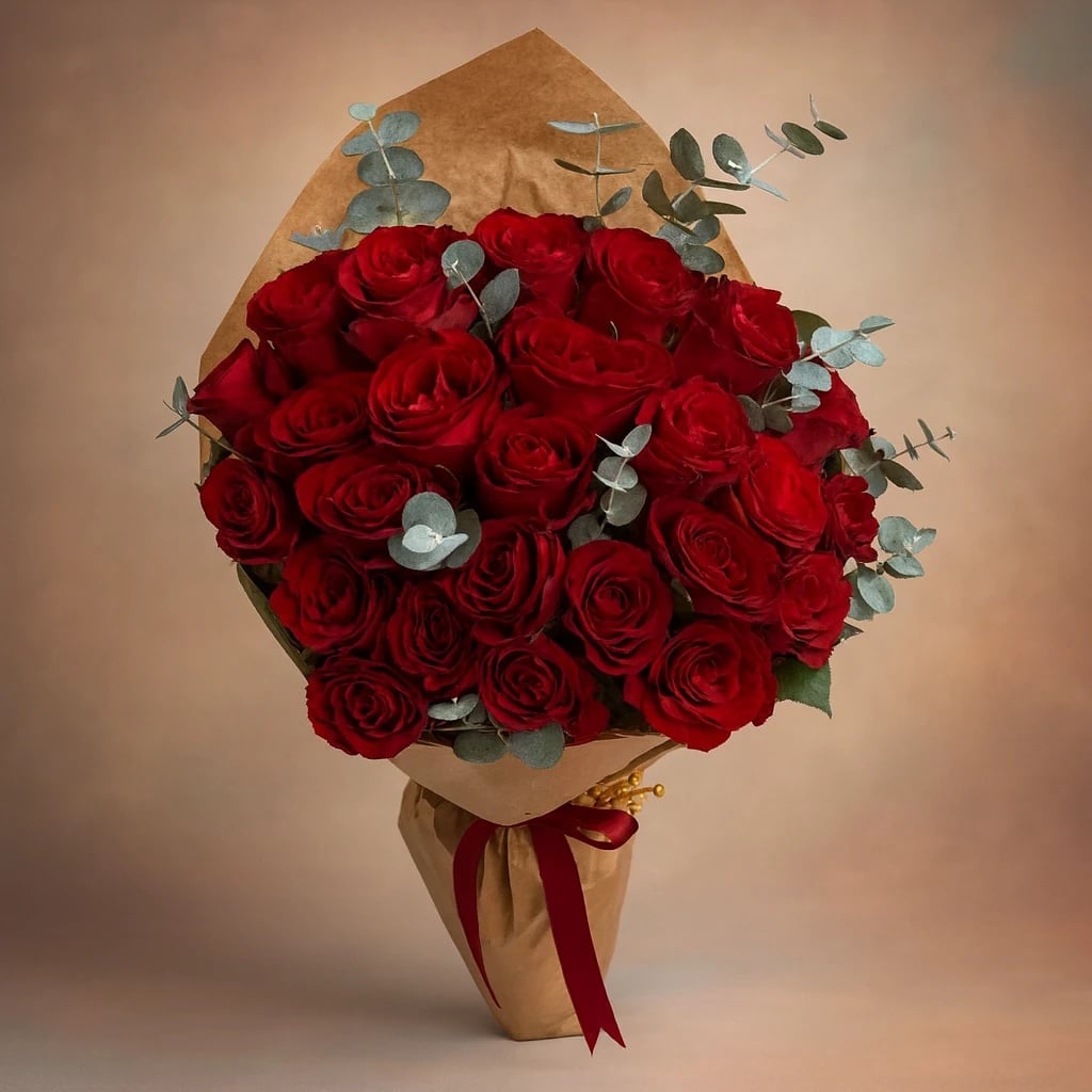 Each red rose symbolizes devotion and enduring togetherness, making this bouquet a meaningful gift for someone special. Carefully wrapped in natural kraft bouquet paper and complemented with fresh eucalyptus and delicate yellow luna accents, the arrangement is finished with a classic red ribbon for a refined and romantic presentation.