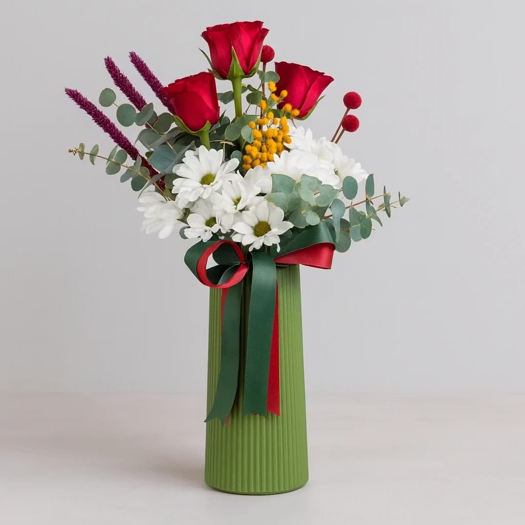 Some gifts express emotions effortlessly through their beauty and meaning. The 3 Red Roses & Daisies in a Green Ribboned Polymer Vase by istanbulflowers is a refined floral arrangement designed to convey love, warmth, and sincerity in the most elegant way. The timeless charm of red roses blends harmoniously with the fresh and cheerful character of daisies, creating a balanced and heartfelt gift.