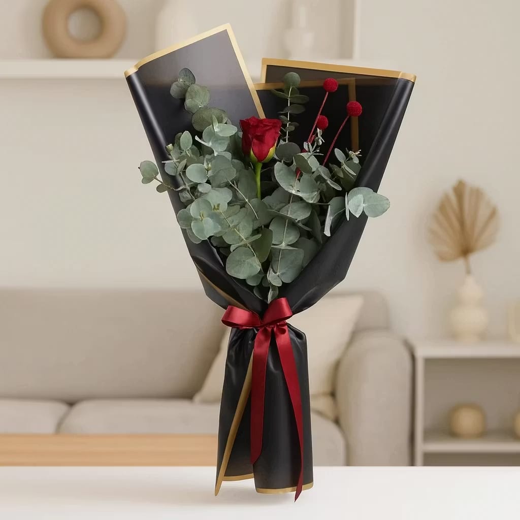 Make a powerful statement with this minimalist yet deeply expressive floral design. Featuring a single premium red rose accented with vibrant red craspedia and fresh eucalyptus leaves, this bouquet reflects elegance, passion, and modern style. The red rose, a timeless symbol of love and devotion, is enhanced by contemporary botanical textures, creating a meaningful gift that speaks without words.