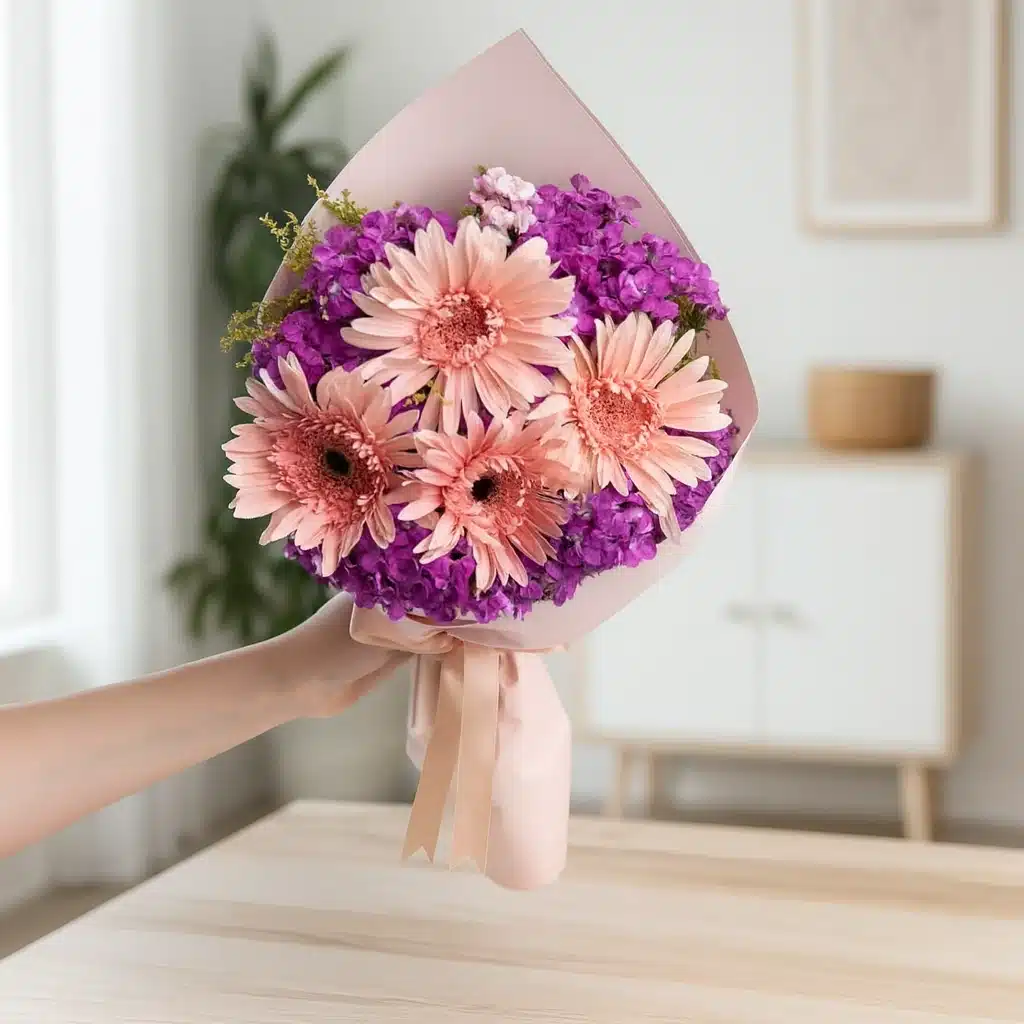 Soft, graceful, and filled with sincere emotion, this charming bouquet features four delicate pink gerberas artfully arranged in an elegant powder‑toned wrapping. With an approximate height of 30–40 cm, the Pudra Bouquet with Pink Gerberas & Hüsnüyusuf is designed to express warmth, affection, and thoughtful care in a beautifully refined way.