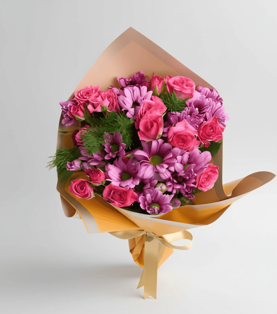 Soft pink spray roses bring a sense of romance and tenderness, while the fresh white daisies represent purity and sincerity. Carefully wrapped in stylish yellow bouquet paper and finished with a delicate golden ribbon, this arrangement turns your emotions into a visually stunning and unforgettable gift.
