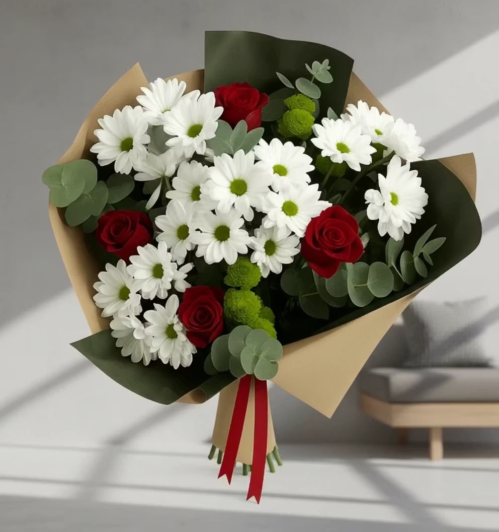 Rose and Daisy Arrangement in Green & Brown Bouquet Wrap, exclusively prepared by