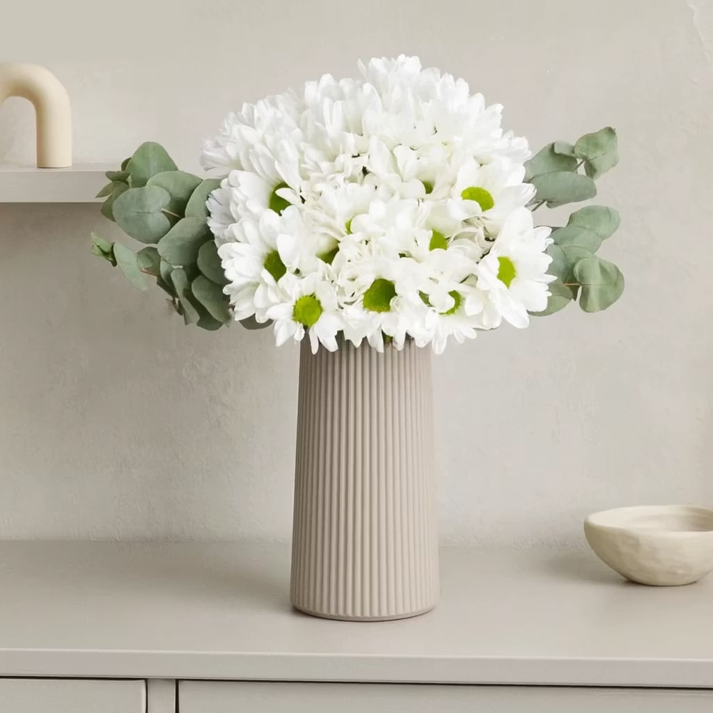White Daisies in a Beige Striped Polymer Vase