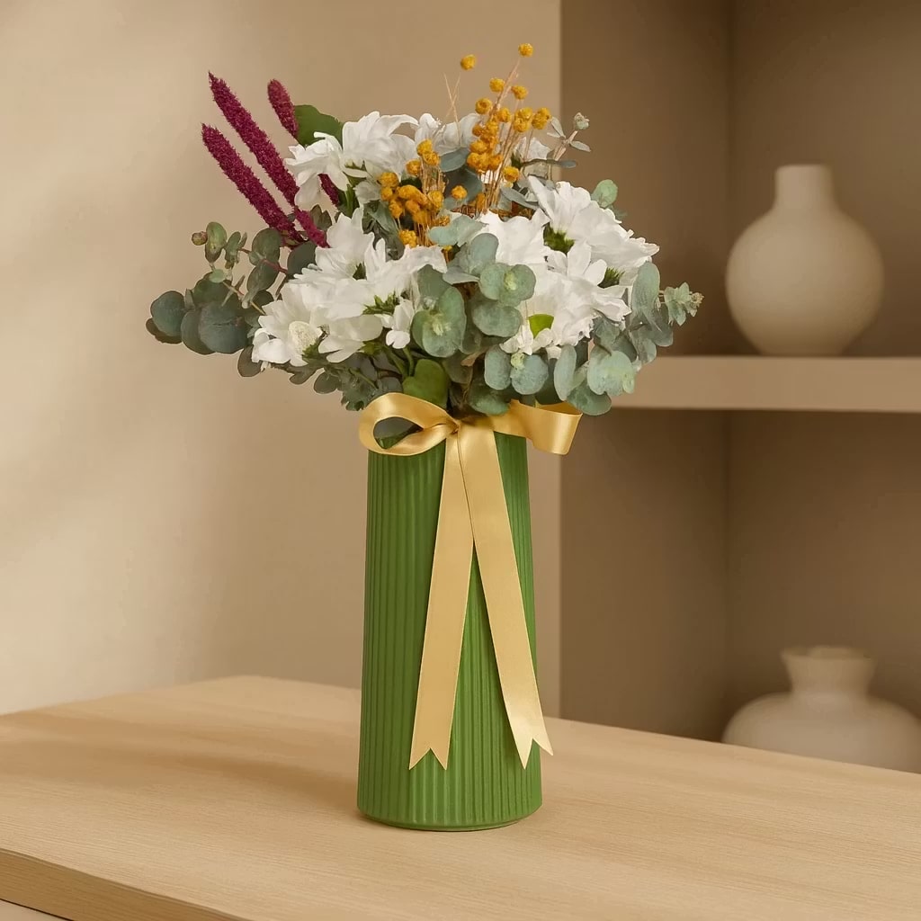 White Daisies in a Green Polymer Vase with Yellow Ribbon